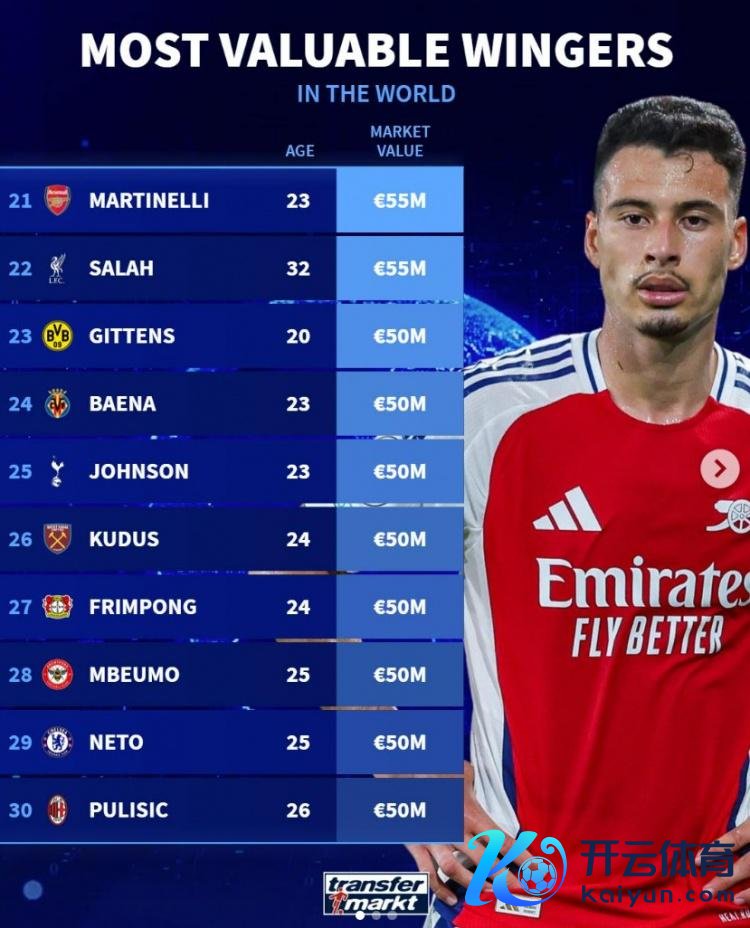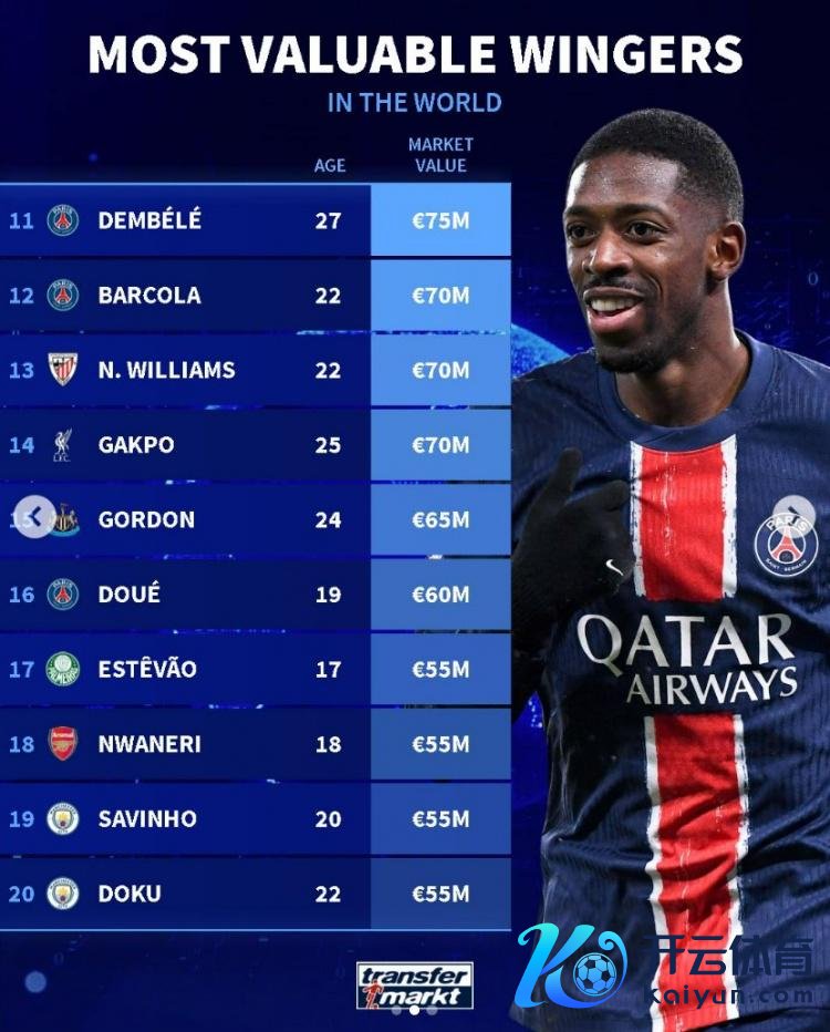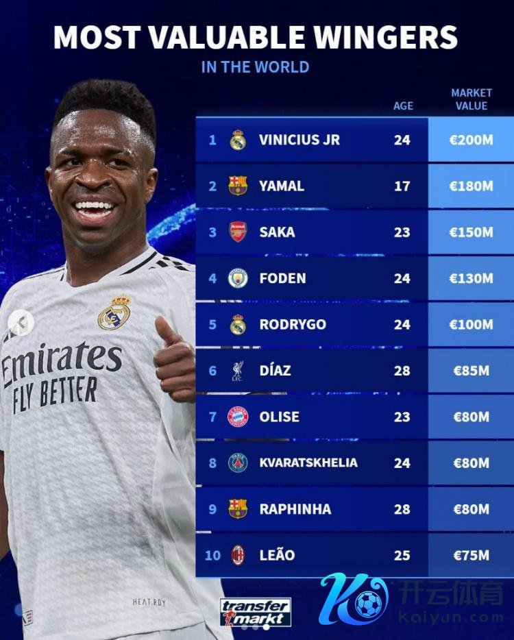 直播吧4月12日讯 德转盘货了寰宇边锋球员身价榜,其中维尼修斯2亿欧居首,次席,以下为具体榜单: