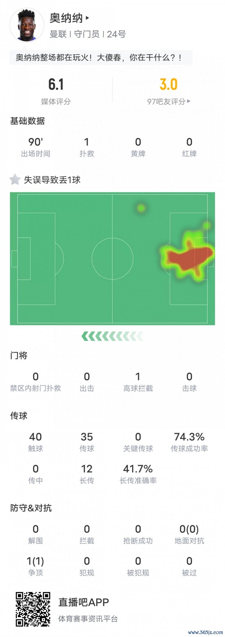 12月13日讯 欧联杯联赛阶段第6轮,曼联2-1比尔森得手。奥纳纳首发出战,全场只消1次扑救,还有1次造作致球队丢球,评分6.1。