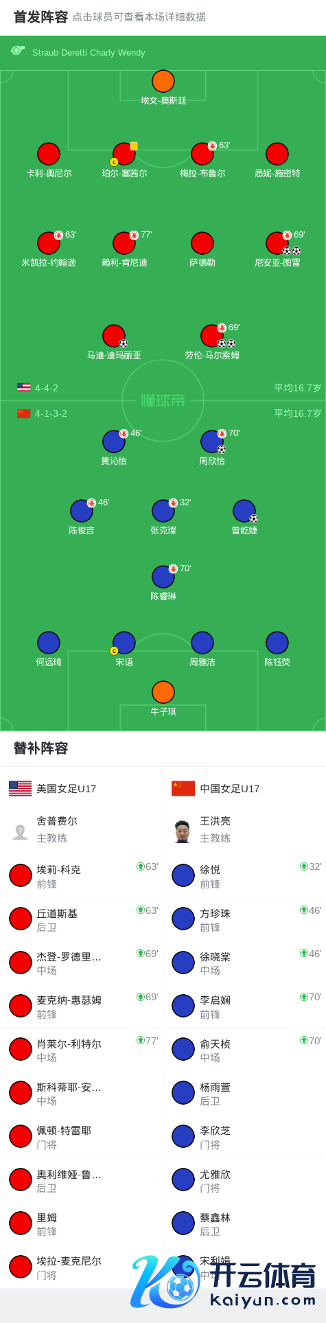 北京时候10月22日,U17女足宇宙杯小组赛第二轮张开较量,好意思国女足U17与中国女足U17张开对决。比赛中,周欣怡最初破门,为中国女足U17获取跳动。随后劳伦-马尔索姆飞速薪金,为好意思国女足U17扳平比分。马迪-迪玛丽亚策应迫切完成进球,匡助球队终端反超。上半场补时阶段,尼安亚-图雷收拢契机再入一球,进一步扩大跳动上风。 易边再战,尼安亚-图雷再度立功,聚首两次攻破对方球门澳门买球网体育信息,展现出壮健的迫切效果。尔后劳伦-马尔索姆再次破门,完本钱场比赛第二次得分,端庄了球队的跳动场面。比赛尾声阶段,曾屹婕为中国女足U17攻入一球,扶植部分弱势。最终全场比分定格为好意思国女足U17 5–2中国女足U17。
