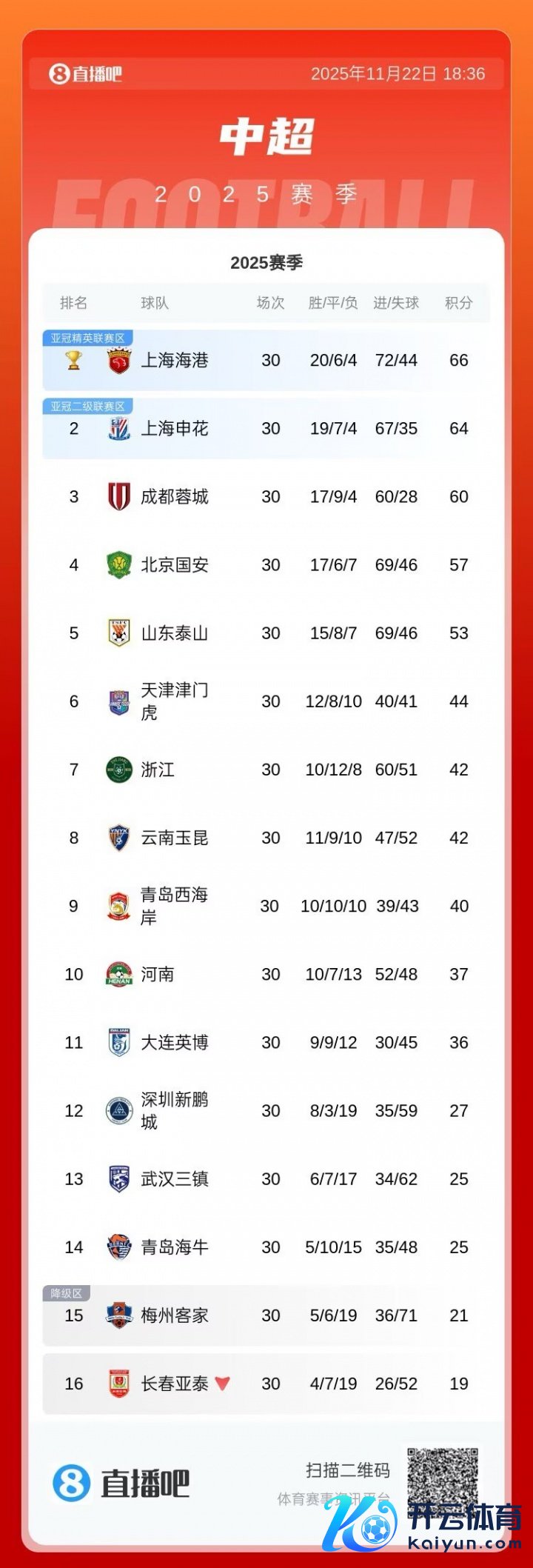 11月22日讯 本赛季中超联赛收官,最终成王人蓉城赢得第4。