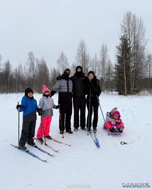 C罗与女友乔治娜带着几个孩子所有度假,出门滑雪。