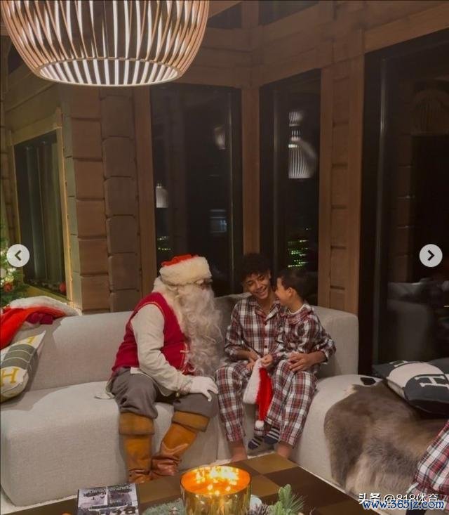 C罗、乔治娜和大男儿迷你罗、龙凤胎伊娃、马特奥、女儿阿拉娜、贝拉一同与圣诞老东谈主合影,圣诞老东谈主也将龙凤胎搂在了怀中,脑怒罕见融洽。