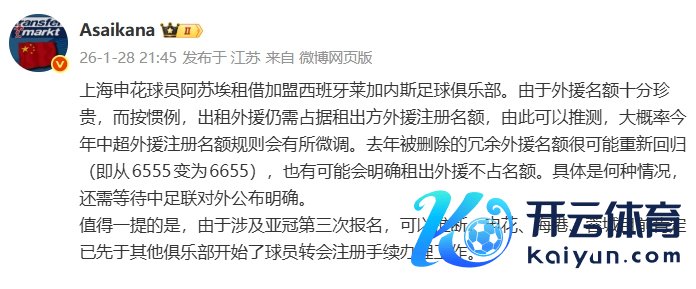 01月28日讯 申花当天官宣外租外助阿苏埃至莱加内斯。德转中国区处分员朱艺道到了新赛季的外助注册计策。