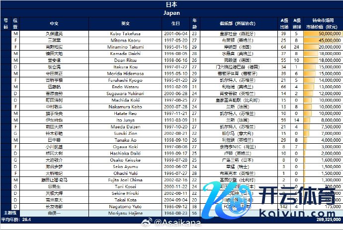 总身价:中国932.5万欧元:日本28932.5万欧元澳门买球网体育信息