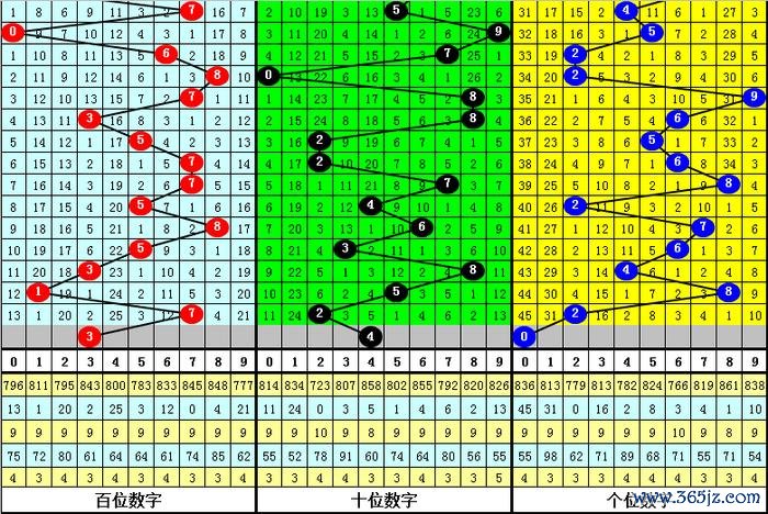 百位上期出现:热号7,该位持续十期以热号出现较多,以冷号出现较少,现在百位热号有5个:1、3、5、7、8,本期看好开出热号再次出现,参考号码3。