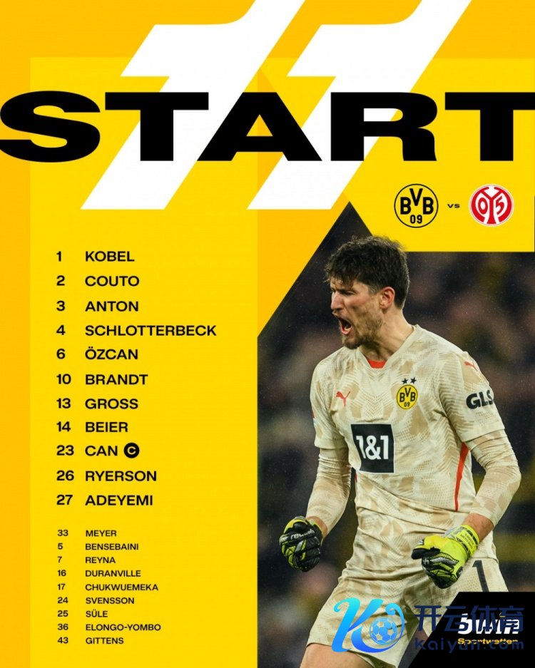 多特首发:1-科贝尔,2-扬-库拖,3-安东,4-施洛特贝克,6-厄兹詹,10-布兰特,13-格罗斯,14-拜尔,23-埃姆雷詹,26-莱尔森,27-阿德耶米