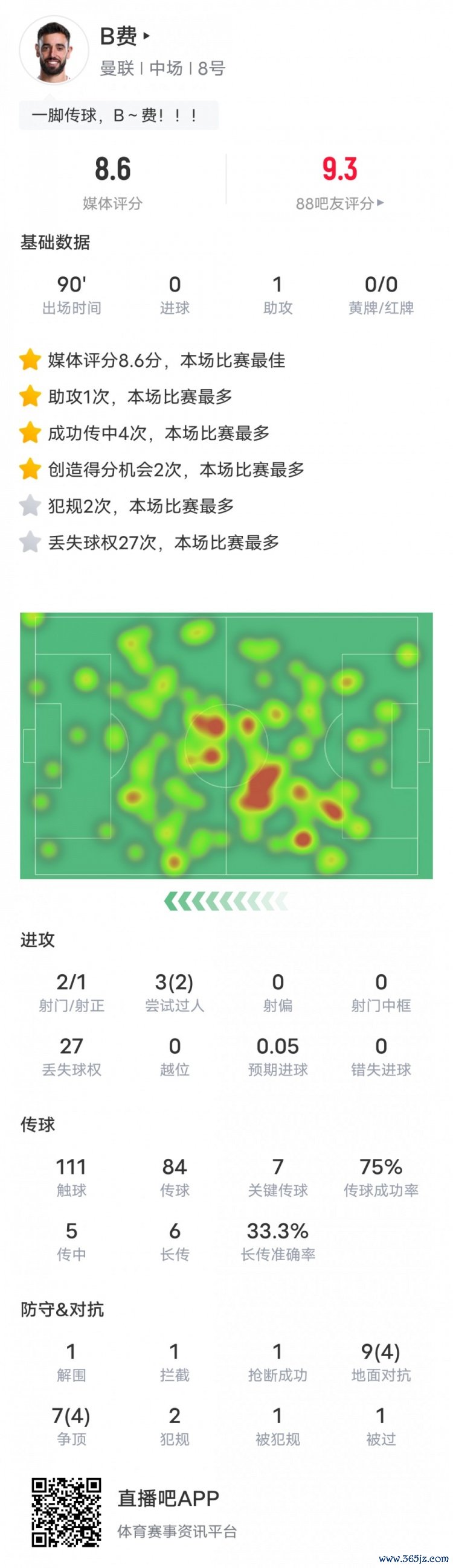12月13日讯 欧联杯联赛阶段第6轮,曼联2-1比尔森见效。B费本场比赛首发出战,送出1次助攻,还有7次要道传球,但也有全场最多的27次丢失球权,评分8.6全场最高。