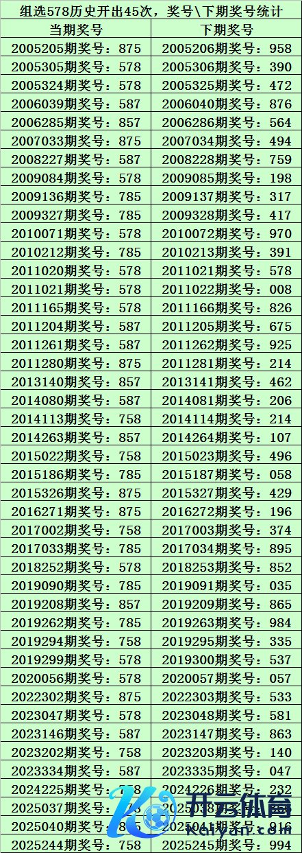 二、组选578分析:罗列三历史上已开出45次组选号码578了,其奖号和下期开出奖号统计如下: