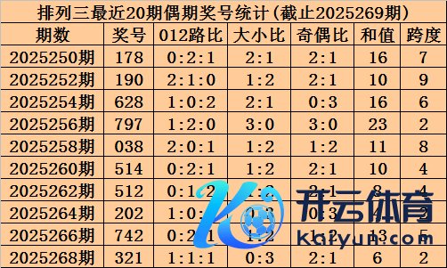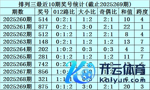 上期归来:成列三2025269期奖号为875,奇偶比为2:1,大小比为3:0,跨度为20。