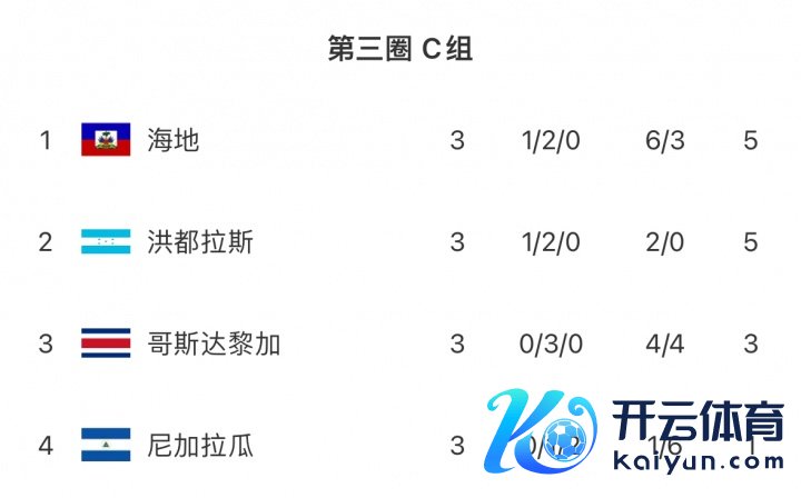 当今在该小组,海地和洪王人拉斯3轮5分分居前二,哥斯达黎加3战3分第三,尼加拉瓜3战1分垫底。