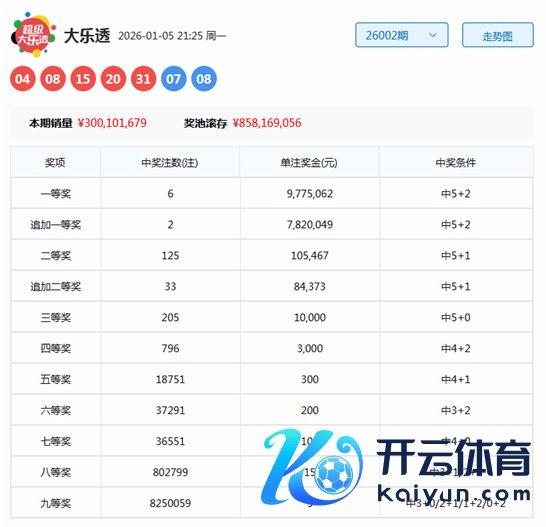 大乐透第2026002期开奖号码为:04、08、15、20、31+07 08。其中前区奖号三区比为2:2:1,奇偶比为2:3,莫得开出重号,后区为全二区号码。