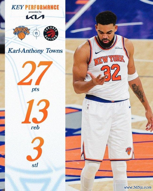 唐斯复出砍下27分13篮板引导尼克斯拆伙3连败,25胜13负稳居东部第三。
