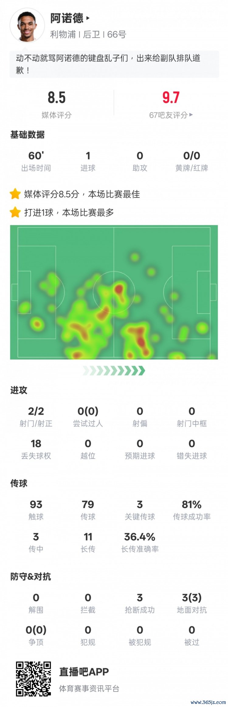 1月11日讯 足总杯第3轮,利物浦4-0英乙球队阿克灵顿。阿诺德首发出战,孝敬1粒天下波,送出3次关键传球,还有3次抢断,评分8.5全场最高。
