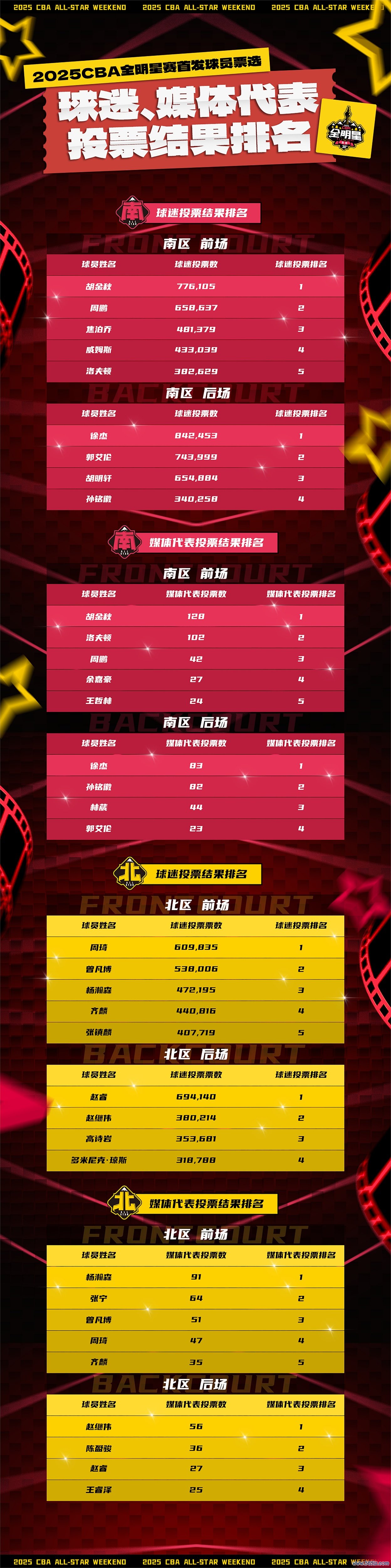 CBA南区全明星首发为:胡金秋、周鹏、洛夫顿、徐杰、郭艾伦。