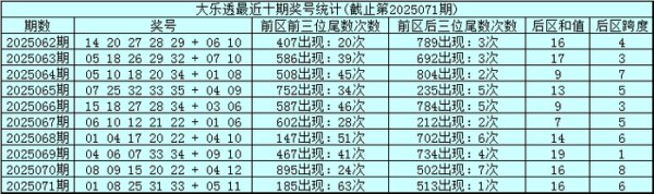 体彩大乐透第25071期奖号开出:0108253133+0511,前区奖号大小比为3:2,012路比为1:3:1,奇偶比为4:1,后区号码和值为16,跨度为6。 大乐透第2025072期前区前后三码定位分析: 前区首尾余数分析:上期前区首尾号码永诀开出01和33,其余数组合为1+3,历史上首尾余数组合1+3共出现了63次,其下期首尾落号频次为:奖号35开出13次,奖号03、33开出10次,奖号01、34开出8次,奖号05、08开出7次,奖号04、07、31开出5次,奖号09、30、32开出4次