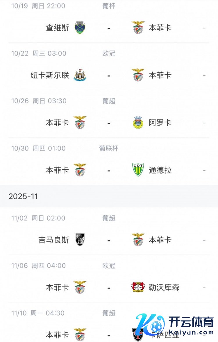 在10月海外比赛日放置后,本菲卡10月19日在葡杯第三轮客场挑战查维斯,22日迎来欧冠客场对阵纽卡的比赛,26日的葡超回到主场对阵阿罗卡。