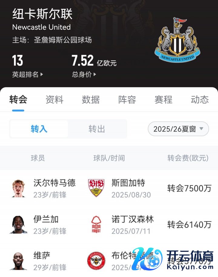 本年夏窗的纽卡在转会市集上也掀翻了一阵波澜,他们一共破耗1.94亿欧在锋线上引进了沃尔特马德、伊兰加和维萨3名球员,并在转会窗终末技艺将伊萨克以1.45亿欧的价钱卖给利物浦。