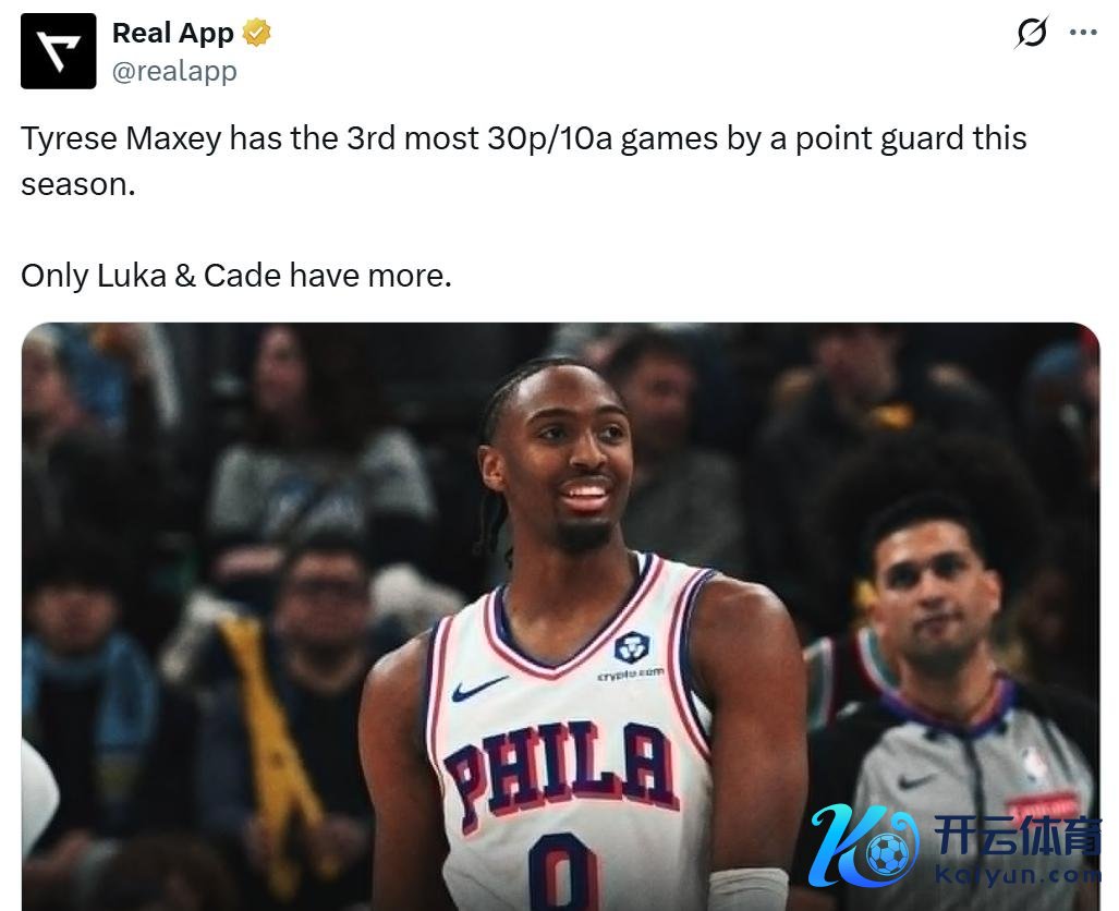 凭借这么的推崇,马克西本赛季也曾3次单场至少交出30分10助,高居控卫位置第三,仅次于东契奇7次与坎宁安6次。