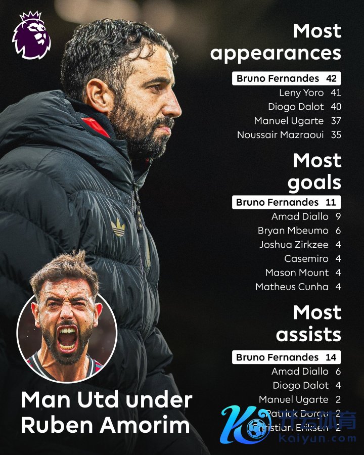 01月05日讯 在阿莫林下课后,英超官方晒出了阿莫林捏教技艺,曼联球员的各项数据,B费在出场数、进球数、助攻数上齐是最多的。