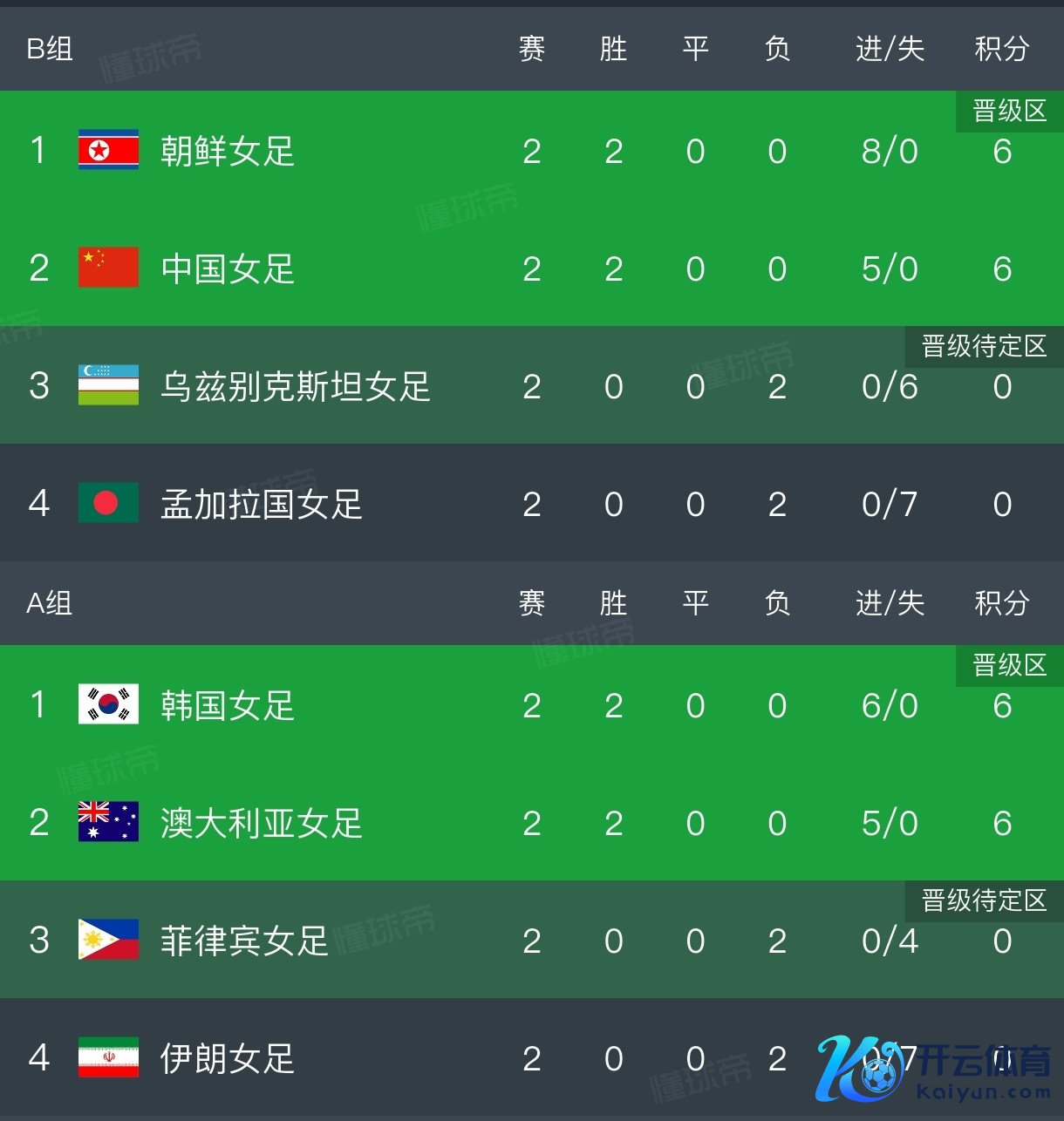 朝鲜女足两战全胜,进8球失0球,净胜球为8个,积6分高居榜首。中国女足雷同两战全胜,进5球失0球,净胜球为5个,积6分位列次席。乌兹别克斯坦和孟加拉国同积0分,分列三、四位。由于跨越第三名已达6分,朝鲜队和中国队如故提前出线,联袂晋级四分之一决赛。