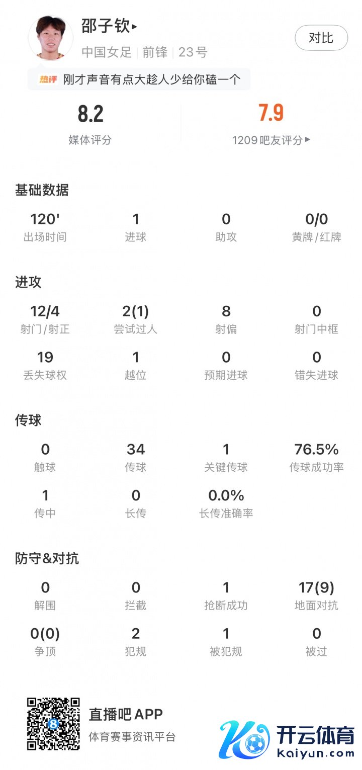 本场比赛邵子钦首发踢满全场,邵子钦本场比赛12次射门4次射正打进1球,8次偏出。创造1次契机,1次越位。