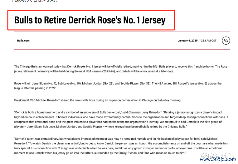 北京时候1月5日,公牛队认真晓谕将在2025-2026赛季退役德里克·罗斯的1号球衣,公牛队官方默示: