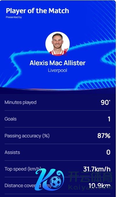 赛后,欧足联官方通知,本场比赛体育录像/图片为利物浦打进第1球的麦卡利斯特当选全场最好球员。