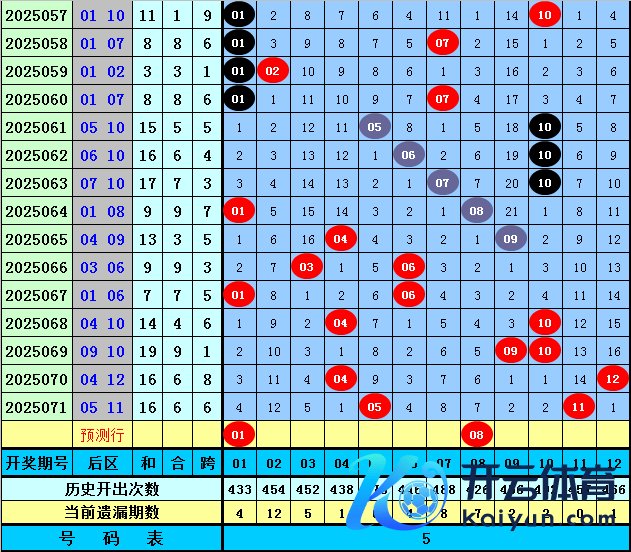 大乐透第2025071期奖号开出:01 08 25 31 33+05 11。其中前区三区比为2:0:3体育赛事直播,和值为98,包含1个重号:08,莫得开出连码,后区开出一奇一偶、一大一小奖号。