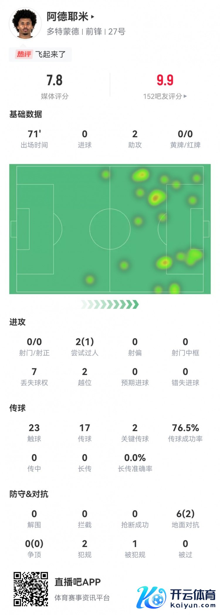 7月2日讯 多特谢世俱杯16强战2-1打败蒙特雷,阿德耶米本场数据如下: