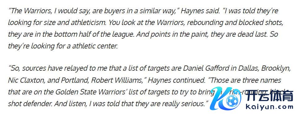 这等于骁雄当今回击的原因,这亦然媒体及NBA名记Chris Haynes会有如下一番提倡和预测的由来。苟简来说,骁雄需要补充内线,最佳是能抢板且冲击篮下的中锋!