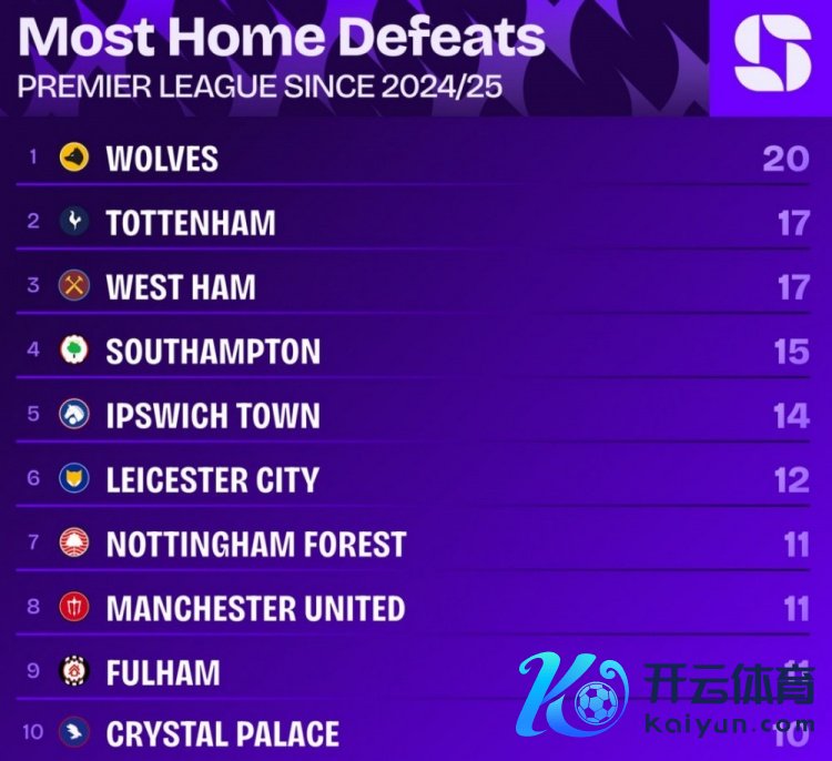 上赛季以来英超主场输球最多榜单: