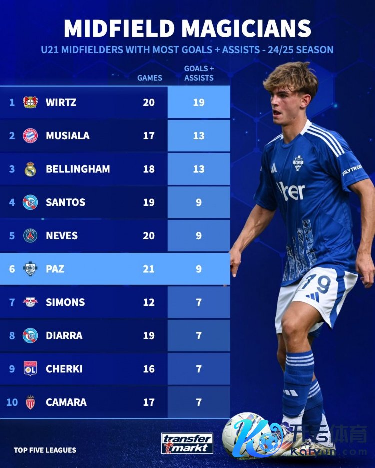 2月7日讯 德国转会市集统计了本赛季五大联赛U21中场参与进球的数目,并排出榜单,维尔茨参与19球居首,尼科-帕斯参与9球名次并排第4位。