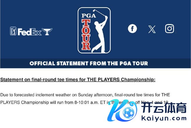 北京时辰3月16日,由于天气预告指出周日将出现恶劣天气,球员锦标赛的终末一轮开球时辰将退换为好意思国东部时辰上昼8点至10点01分,三东谈主一组,诀别从一号洞和十号洞起程。